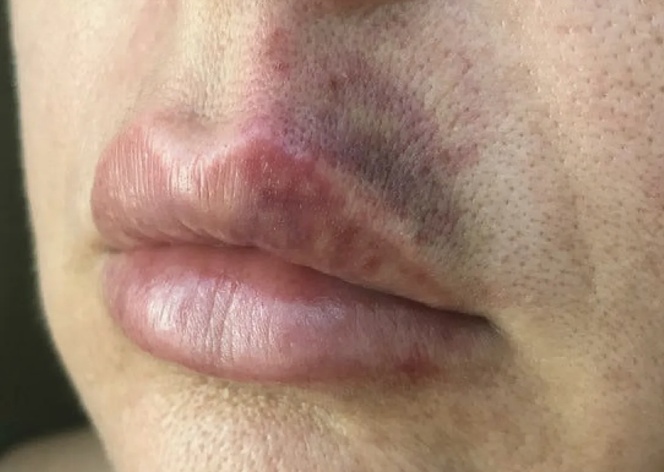 A visual of what a vascular occlusion may present as, marked by skin color changes that spread beyond the lip border.